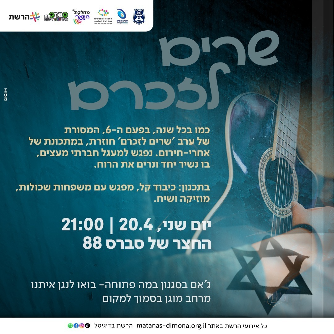 ביום שני, נתכנס יחד לערב מיוחד, עוצמתי ונוגע ללב, בו נשיר יחד במטרה להוקיר ולזכור את הנופלים שמסרו את חייהם למעננו.